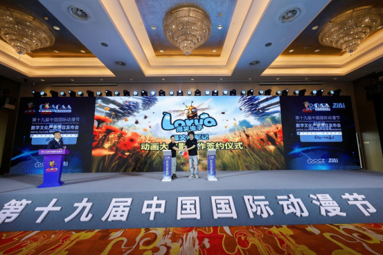 流彩动画创始人、总经理杨加助与深圳拉瓦数字动漫授权总经理刘庆峰现场签约并发布了动画大电影《爆笑虫子之爆笑从军记》项目。