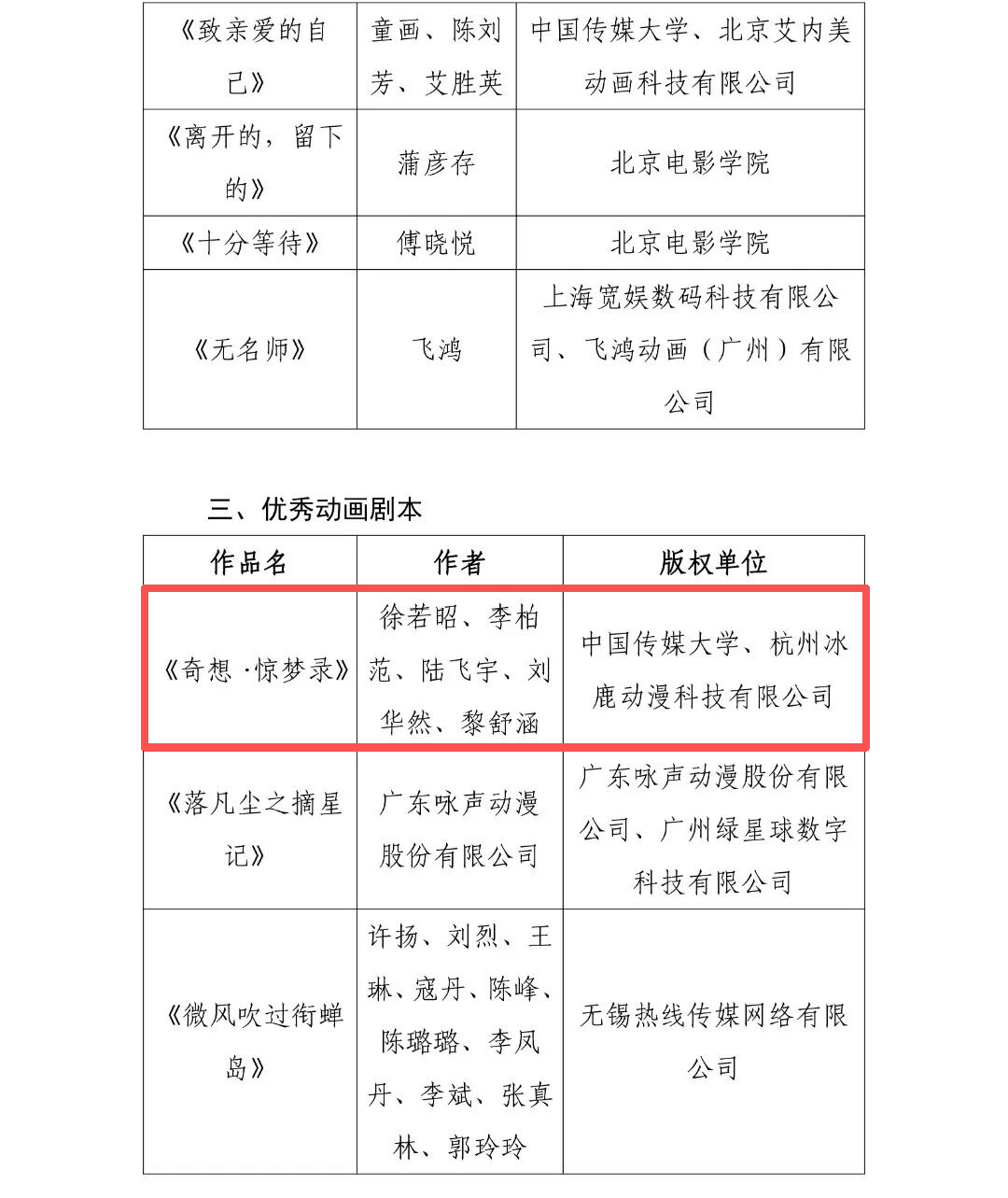 | 为进一步推动动画精品创作,发掘培养优秀青年动画创作人才,国家广播电视总局联合教育部高等学校动画、数字媒体专业教学指导委员会于2024年9月启动首届“新‘动’力——中国原创动画扶持计划”。 经专家评审,评出杭产动画《糖果狂想曲》等5部作品为优秀动画短片,《空山》等5部作品为潜力动画短片,杭产动画《奇想·惊梦录》等3部作品为优秀动画剧本。这些作品创意新颖、制作精良,体现了新时代青年动画创作人才积极投身精品创作的精神风貌。河北传媒学院等10家单位被评为优秀组织单位,现向社会公布。